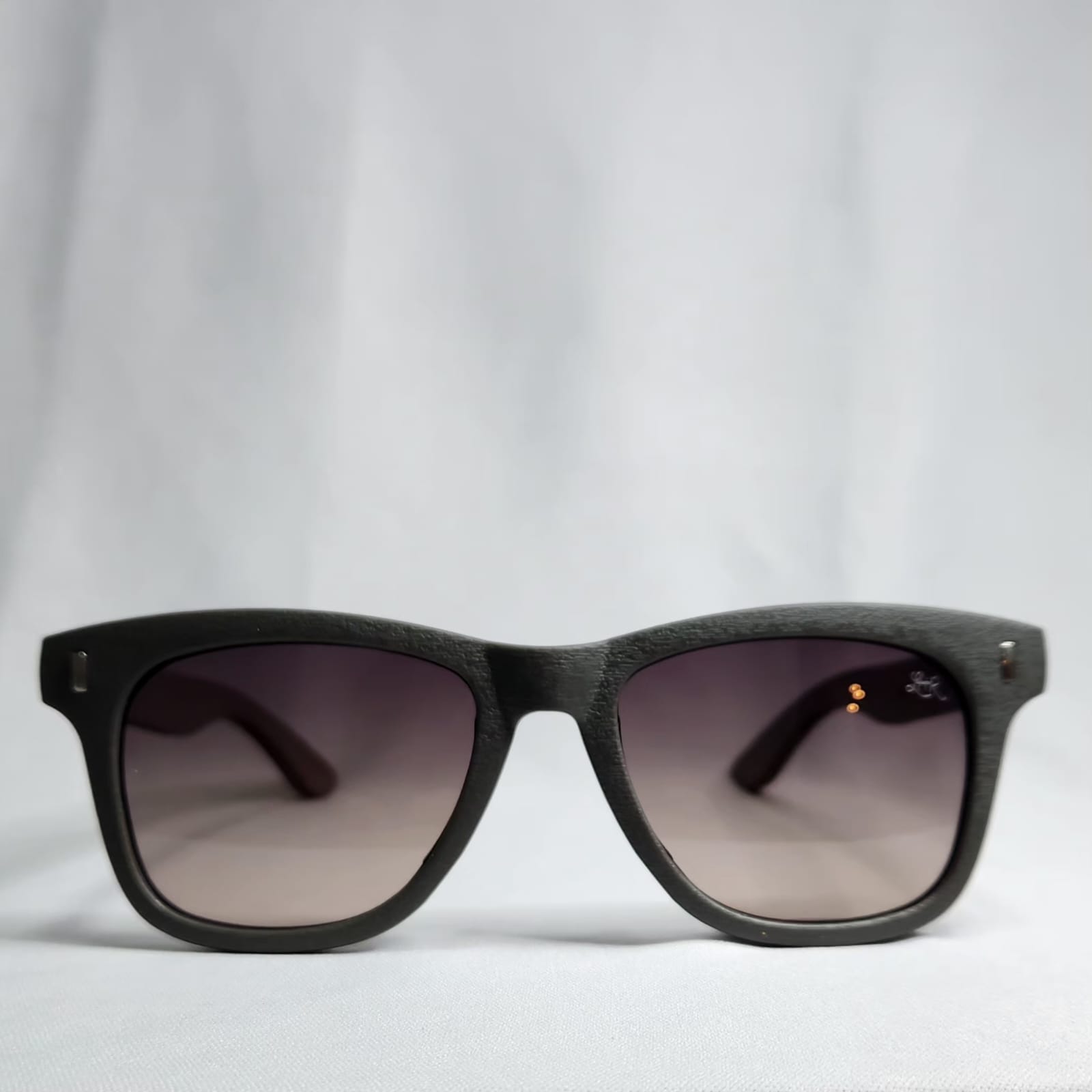 Cor: Armação em acetato cinza fosco e haste em madeira.